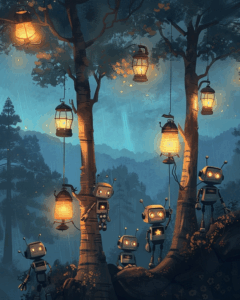 朝になると、森全体がきらめき、ロボットどうぶつたちは「ピポピポ!」と元気に挨拶。